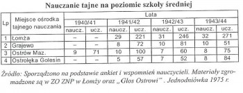 Witold Wincenciak, we wspomnianej wyżej publikacji, w ujęciu tabelarycznym przedstawia szacunkową liczbę uczniów i nauczycieli biorących udział w tajnym nauczaniu w regionie łomżyńskim, obejmującym swym zasięgiem poziom szkoły średniej. Tę tabelę prezentuję poniżej.