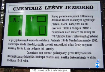 3. Drugą tablicę umieszczono obok krzyża ołtarza polowego. Głosi ona: „W tym lesie hitlerowcy dokonywali masowych egzekucji na ludności cywilnej. W latach 1941 -1945 rozstrzeliwano tu członków ruchu oporu i więźniów z Łomży. 15 lipca 1943 roku hitlerowcy stracili 50 osób ze środowiska łomżyńskiej inteligencji. W tym samym roku zamordowali 130 osób – mieszkańców z Domu Starców w Łomży i Polaków ze wsi Przytuły”.