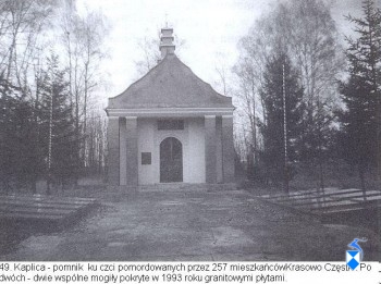 Dziś całość, otoczona siatką z ozdobną bramą i furtkami, stanowi cmentarz i centralną część, liczących 19 gospodarstw, Krasowa Częstek. Nad drzwiami kaplicy napis; „Kaplica-pomnik fundacji ks. Kaczyńskiego Józefa”. Wewnątrz na ołtarzu obraz Matki Boskiej Częstochowskiej, a po bokach pamiątki: w gablotach szczątki opalonych desek, a za szkłem zdjęcia. Różne. Ale najwięcej tych, które ks. Kaczyński zrobił tuż przed zagładą wsi. No i dwie tablice: ta po lewej, drobniutkimi literkami wymienia 257 straconych. Ta po prawej jest dużo mniejsza. Na niej widnieje tylko 35 osób – tych którzy ocaleli, a z których tylko 8 pozostało we wsi. Dzisiejsi mieszkańcy Krasowa Częstek, to przybysze z innych stron.
