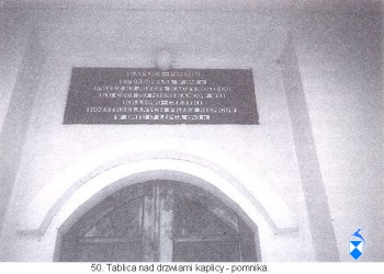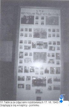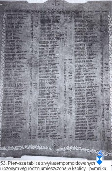 Jak wspomina ks. kanonik Józef Kaczyński, w kilka dni po pacyfikacji, ci którzy pozostali, zeszli się i sporządzili listę męczenników według kolejności gospodarstw pomordowanych. Lista ta została następnie umieszczona w wybudowanej przez ks. Kaczyńskiego kaplicy. Niestety, w okresie, który wspominam przy okazji omawiania leśnych cmentarzy, władze zamalowały farbą olejną tę, pierwszą listę i tablicę zapełniły na nowo nazwiskami, tym razem w kolejności alfabetycznej, przy czym nie uniknięto wielu błędów.