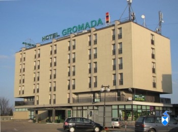 Hotel Gromada stojący częściowo na tyłach placu dawnego kościoła ewangelickiego