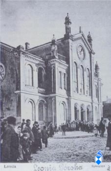 Jak pisze ks. Witold Jemielity – „….W 1812 r. istniała w Łomży bóżnica. W 1831 r. przejęły ją wojska rosyjskie i budowla uległa poważnemu zniszczeniu. W rok potem starozakonni zwrócili się do rządu o wsparcie finansowe na postawienie nowej bóżnicy. Na poddaszu dotychczasowej synagogi mieściły się biura gminy, mieszkanie rabina i sekretariat sądu. Plany nowej synagogi wykonał Marconi i oczekiwano na rozpoczęcie budowy. Tak jednak nie stało się. W 1858 r. modlono się w starej drewnianej bóżnicy, która była w złym stanie. Nadal zamierzano budować nową bożnicę. Dopiero w latach 1878 – 1889 r. wzniesiono wielką synagogę, która znajdowana się na skrzyżowaniu ulic Senatorskiej i Giełczyńskiej. Przy jej budowie wykorzystano dawne plany Marconiego. Synagoga uległa zniszczeniu w 1939 r. podczas bombardowania miasta. Była też synagoga na przedmieściu Łomży, przy ulicy Ostrołęckiej 10 i ona uległa zniszczeniu podczas działań wojennych….”