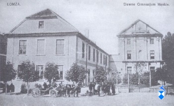6. Gimnazjum Męskie. W 1862 r. wydano ustawę o reformie oświaty, powszechnie określanej jako „reforma Wielopolskiego”. Przywrócono szkole charakter polski a młodzież wyzwolono z rygoru opartego na systemie kar. W Warszawie utworzono trzy gimnazja, a po jednym w Kaliszu, Kielcach, Łomży, Piotrkowie, Pińczowie, Płocku, Radomiu, Siedlcach, Suwałkach i Szczebrzeszynie. Każde gimnazjum posiadało czternaście etatów nauczycielskich i trzy etaty administracyjne. W 1872 r. w Łomży dodano klasę ósmą, a w rok potem jeszcze klasę wstępną. Od 5 lutego 1869 r. przyjęto nazwę: ”Łomżyńskie Klasyczne Gimnazjum Męskie” i tak pozostało do czasu wojny. W 1876 r. było 327 uczniów, w 1886 r. – 458, w 1896 r. – 339, w 1906 r. – 228, w 1914 r. – 277; wśród nich katolicy, prawosławni, wyznawcy mojżeszowi, ewangelicy. Nauczycieli: w 1909 r. – 20, w 1911 r. – 21, w 1914 r. – 21. Gimnazjum istniało do pierwszej wojny światowej. W lutym 1905 r. w szkołach Królestwa Polskiego wybuchły strajki, także w Łomży. Szkole rządowej zarzucano: obcy język wykładowy, brak związku pomiędzy szkołą a miejscowym społeczeństwem, nieodpowiedzialność zarządów szkolnych przed krajem. Gimnazjum to, jak wszystkie poprzednie w Łomży, kształciło chłopców. Stanowiło ono niejako kontynuację poprzednich. Podkreślał to i wspólny gmach szkolny, niegdyś jezuicki, potem pijarski. Zaszły jednak pewne zmiany. Pierwotnie kompleks budynków miał kształt podkowy.