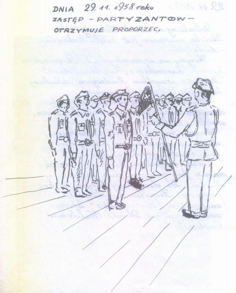 Fot. Rysunek z kroniki – Zbiórka 5 DH na grobach na cmentarzu głównym w dniu 10.10.1958 r. (ze zbiorów hm. W. Piłaszewicz)
