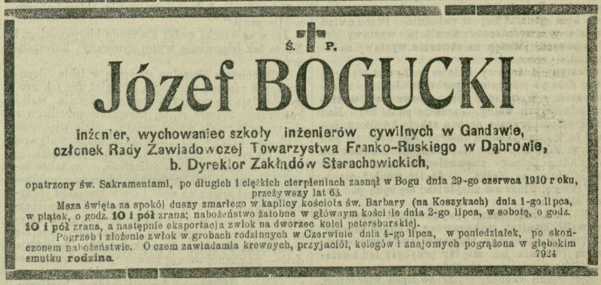 Józef Bogucki, powstaniec styczniowy, inżynier, urodził się w 1843 roku we wsi Laski w ziemi łomżyńskiej. Pochodził z w rodziny ziemiańskiej. Nauki początkowe pobierał w Łomży, a następnie w gimnazjum realnym Warszawie. Około 1862 roku wstąpił do Instytutu Politechnicznego i Rolniczo – Leśnego w Puławach. Tu zastał go wybuch Powstania Styczniowego, w którym bierze aktywny udział. Po upadku zrywu niepodległościowego udał się na emigrację do Paryża, a następnie do Gandawy, gdzie ukończył z wyróżnieniem Szkołę Inżynierii Cywilnej. Pracę zawodową zaczął w kolejnictwie. Pracował przy projektowaniu, budowie i utrzymaniu dróg żelaznych na Węgrzech, Galicji i Królestwie. W 1869 roku brał udział w poszukiwaniach tras i opracowywaniu projektów kolejowych w dorzeczu rzeki Wagi i Banacie. Do 1871 roku był zatrudniony jako inżynier sekcyjny przy budowie drogi żelaznej prowadzącej z Karłowca do Rieki / obecnie Chorwacja /. Powołany na stanowisko inżyniera oddziałowego pracował przy budowie drogi żelaznej Arcyksięcia Albrechta w Galicji. Po jej zakończeniu przeniósł się do Warszawy. Pracował na kolei Warszawsko – Wiedeńskiej i Nadwiślańskiej. Jak napisano o nim „Na wszystkich powyżej wymienionych stanowiskach (…) wyróżniał się zaszczytnie, zarówno biegłością zawodową, jak i wysokim poczuciem obowiązku, sumiennością i pracowitością”. Swój nieprzeciętny talent miał możliwość ujawnić również jako doradca techniczny i pełnomocnik kilku instytucji finansowych m.in. Banku Handlowego. Przez krótki czas sprawował nadzór nad zakładem górniczym w Drzewicy w opoczyńskim. Znakomicie sprawdził się jako fachowiec przy budowie nowoczesnego tartaku w Tajkurach kołoZdołbunowa na Wołyniu.