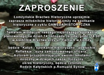 Tematem wiodącym naszego najbliższego spotkania planowanego na dzień 14 listopada (środa) godz: 18:00 w siedzibie Bractwa przy ul. Farna 9 w Łomży będzie „Katyń – spotkanie historyczno – poetyckie Refleksje – syna zamordowanego oficera”
