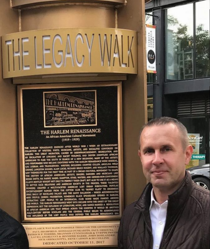 Rok 2017 Muzeum na powietrzu „The Legacy Walk”. Krzysztof wykonał projekt tablicy w brązie poświęconej „The Harlem Renaissance”, która zainstalowana jest na ulicy w Chicago. Wzdłuż ulicy Halsted ustawione są tablice z brązu – swoiste muzeum na powietrzu. Wszystkie dotychczas wykonane tablice były stworzone w oparciu o stare fotografie udostępnione przez muzea, natomiast tablica zaprojektowana przez Krzysztofa jest jedynym, oryginalnym projektem wykonanym przez współczesnego artystę na zamówienie miasta. Odsłonięcie tablicy było ważnym wydarzeniem kulturalnym. Były władze Chicago, różne osobistości, mieszkańcy miasta i wszelkie media. Krzysztof podpisał oficjalne przekazanie tablicy na rzecz miasta jako darowiznę.