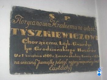 Obok drzwi wejściowych. z prawej strony, pod chórem wmurowany w ścianę marmur, poświęcony pamięci Fłoryana Hr. Tyszkiewicza, Chorążego Lejb-Gwardyi, zmarłego 1831 r. w okolicy Łomży, w 23 roku życia, przez brata jego Eustachego. Więcej pomników kościół nie posiada.