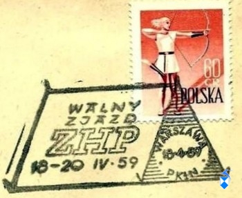 Podczas Wielkanocnych ferii w końcu marca 1959 r. spotykamy się w komendzie hufca. Dyskutujemy o aktualnej sytuacji w naszym hufcu i w białostockiej chorągwi. Jesteśmy radzi, że na zbliżającym się Walnym Zjeździe ZHP w Warszawie będzie reprezentować nasz hufiec Zbyszek Kamionowski. Będziemy więc mieli wiadomości i materiały zjazdowe z pierwszej ręki. Po powrocie na uczelnię czytam uważnie doniesienia prasowe o tym Zjeździe, którego uczestnicy obradują od 18 (sobota) do 21 (wtorek) kwietnia 1959 r. w Sali Kongresowej Pałacu Kultury i Nauki w Warszawie. Przy okazji załączam kserokopię okolicznościowego stempla pocztowego, na którym jest niewłaściwa data trwania Walnego Zjazdu ZHP.