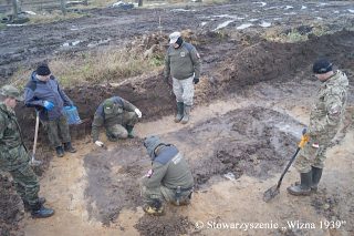 W trakcie pierwszych prac badacze natrafili jednak niespodziewanie na łuski od amunicji stosowanej w trakcie walk z 1920 r. , a następnie na ślady zbiorowej mogiły mieszczącej ludzkie szczątki. Po uzyskaniu zgody odnośnych władz tj policji i prokuratora na dalsze prace terenowe, członkowie grupy poszukiwawczej stowarzyszenia pod nadzorem archeologa w dniach 27-28 listopada 2017r, przeprowadzili ekshumację odnalezionych szczątków.