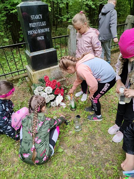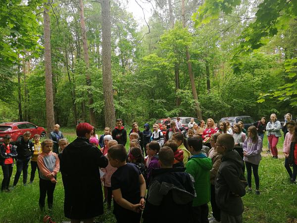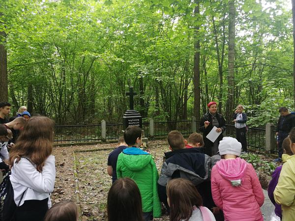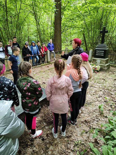 W dniu 1 czerwca 2021 r. lekcja wprawdzie przesunięta w czasie, ale na szczęście odbyła się! To był wyjątkowy prezent z okazji Dnia Dziecka – dla uczestników lekcji, ale też dla dzieci zamordowanych na tej leśnej polanie (było ich dziewięcioro oraz dwoje w okresie prenatalnym), bo przecież najlepszym prezentem dla nich jest modlitwa i wciąż żywa pamięć, jak głosi napis autorstwa kadry pedagogicznej szkoły z Dobrzyjałowa umieszczony podczas dzisiejszej lekcji w Złotej Księdze dokumentującej te wyjątkowe spotkania. Uczestnikom wzorem lat ubiegłych opowiedziałam o trzech masowych niemieckich egzekucjach, przybliżyłam sylwetki niektórych Ofiar, bliżej przedstawiłam postać ostatniego żyjącego skazańca – Pana Jerzego Smurzyńskiego, opowiedziałam o Rodzinie Jeziorkowskiej, a nadto na zakończenie przeprowadziłam mini quiz wiedzy o tej leśnej nekropolii, który uczniowie pomyślnie zaliczyli. Uczniowie brali aktywny udział w lekcji żywo reagując na moją narrację, zadając wiele pytań, dociekając prawdy, dzieląc się swoją wiedzą na temat czasu wojny pochodzącą nie tylko z filmów, ale głównie od kochanych dziadków.