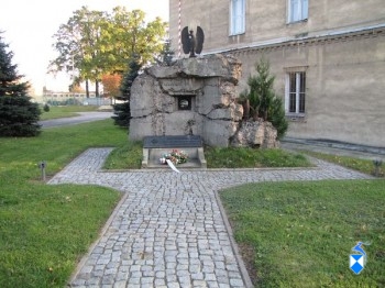 Na tablicy przy pomniku (znajduje się w koszarach) napis: Żołnierzom 33 P.P. Walczącym i Poległym W Obronie Ojczyzny.