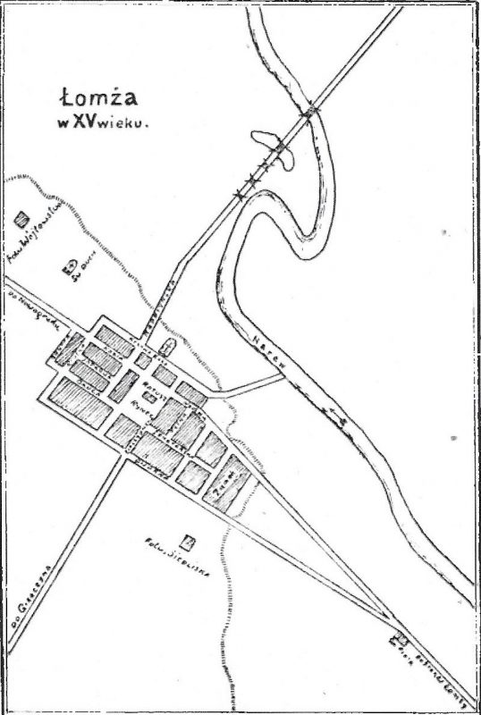 Niegdyś Mazowsze, jak i kraj cały, okryte było puszczami, przez które nie bardzo bezpiecznie było podróżować. Drapieżne zwierzęta i różnoplemienne bandy koczownicze zazdrośnie strzegły puszcz przed człowiekiem, niosącym kulturę i cywilizację, jedyną bezpieczną i wygodną drogą były rzeki. Rzekami ciągnęli kupcy, wioząc piękne i dziwne zamorskie towary, aby je wymienić na bogactwa miejscowe, jak bursztyn, miód i skóry zwierzęce. Rzekami wędrowali misjonarze, apostołowie słowa bożego, aby krzewić wiarę świętą wśród pogańskiej ludności. Nad brzegami rzek zaczęły powstawać osiedla ludzi, zamieniających dotychczasowy koczowniczy, pasterski swój żywot na osiadły, rolniczy. W osiedlach tych zatrzymywali się kupcy i budowali tam swe składy. Na krańcu wzgórza, wznoszącego się na 420 stóp nad poziomem morza i zajmującego środkową część obecnego powiatu łomżyńskiego, na lewym brzegu Narwi, w miejscu gdzie rzeka skręca, „załamuje się”, lat temu przeszło 1000 powstała osada, a następnie gród, który od figury miejsca otrzymał nazwę „Załom”. Z biegiem czasu nazwę te zniekształcono na Łom – za. a w późniejszych czasach, gdy język urobił się na Łomża. Według innej wersji, nazwa miasta Łomży pochodzi stąd, że osiedle powstałe na miejscu teraźniejszego miasta, okrążone było dziewiczemi lasami, w których znajdowało się dużo zwalonych przez burze odwiecznych drzew i pni, co tamowało dostęp.