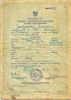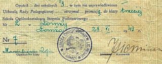 Przyjrzałem się teraz bliżej mojemu świadectwu z II. klasy z 28 czerwca 1949 roku. Pod godłem państwowym jest napis: Świadectwo Szkoły Ogólnokształcącej Stopnia Podstawowego, powyżej – podłużna pieczątka z napisem Publiczna Szkoła Powszechna nr 2 w Łomży. W dolnej, środkowej części świadectwa jest granatowy odcisk urzędowej pieczęci ze skróconym napisem w okręgu: Szkoła Ćwiczeń Państw. Lic. Pedagog. w Łomży.