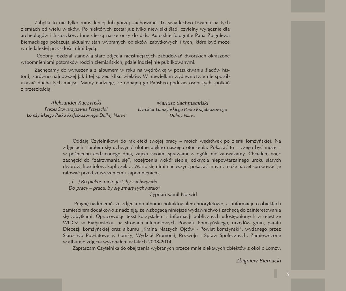 Oddaję Czytelnikowi do rąk efekt swojej pracy – moich wędrówek po ziemi łomżyńskiej. Na zdjęciach starałem się uchwycić ulotne piękno naszego otoczenia. Pokazać to – czego być może – w pośpiechu codziennego dnia, zajęci swoimi sprawami w ogóle nie zauważamy. Chciałem więc zachęcić do “zatrzymania się”, rozejrzenia wokół siebie, odkrycia niepowtarzalnego uroku starych dworów, kościołów, kapliczek … Warto się nimi nacieszyć, pokazać innym, może nawet spróbować je ratować przed zniszczeniem i zapomnieniem.