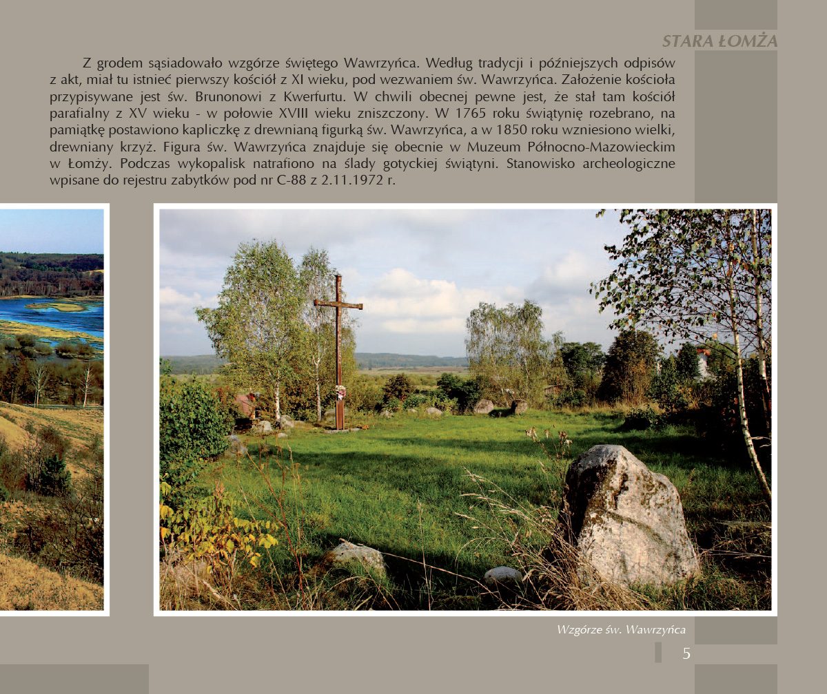Z grodem sąsiadowało wzgórze świętego Wawrzyńca. Według tradycji i późniejszych odpisów z akt, miał tu istnieć pierwszy kościół z XI wieku, pod wezwaniem św. Wawrzyńca. Założenie kościoła przypisywane jest św. Brunonowi z Kwerfurtu. W chwili obecnej pewne jest, że stał tam kościół parafialny z XV wieku – w połowie XVIII wieku zniszczony. W 1765 roku świątynię rozebrano, na pamiątkę postawiono kapliczkę z drewnianą figurką św. Wawrzyńca, a w 1850 roku wzniesiono wielki, drewniany krzyż. Figura św. Wawrzyńca znajduje się obecnie w Muzeum Północno-Mazowieckim w Łomży. Podczas wykopalisk natrafiono na ślady gotyckiej świątyni. Stanowisko archeologiczne wpisane do rejestru zabytków pod nr C-88 z 2.11.1972 r.