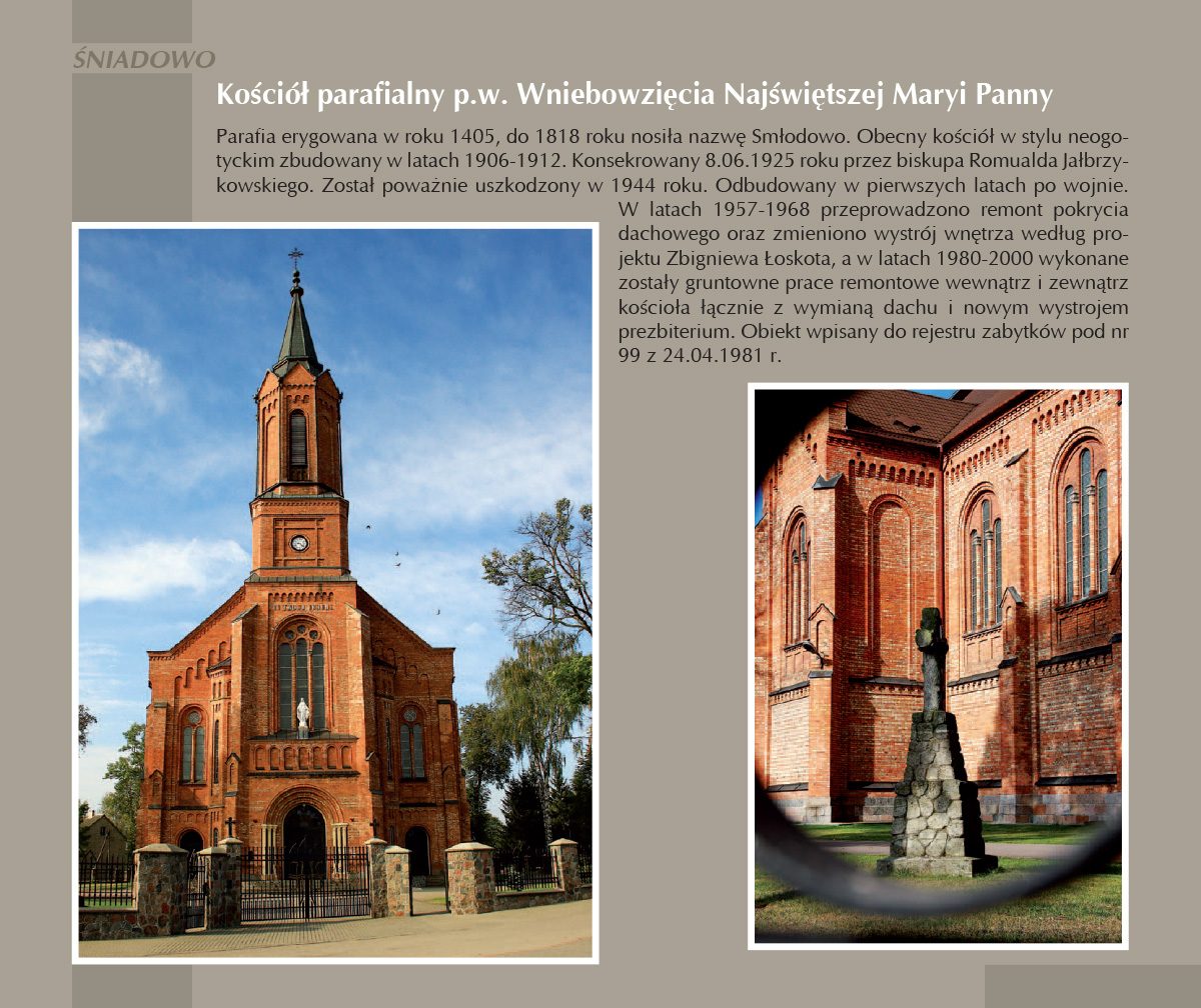 Parafia erygowana w roku 1405, do 1818 roku nosiła nazwę Smłodowo. Obecny kościół w stylu neogotyckim zbudowany w latach 1906-1912. Konsekrowany 8.06.1925 roku przez biskupa Romualda Jałbrzykowskiego. Został poważnie uszkodzony w 1944 roku. Odbudowany w pierwszych latach po wojnie. W latach 1957-1968 przeprowadzono remont pokrycia dachowego oraz zmieniono wystrój wnętrza według projektu Zbigniewa Łoskota, a w latach 1980-2000 wykonane zostały gruntowne prace remontowe wewnątrz i zewnątrz kościoła łącznie z wymianą dachu i nowym wystrojem prezbiterium. Obiekt wpisany do rejestru zabytków pod nr 99 z 24.04.1981 r.