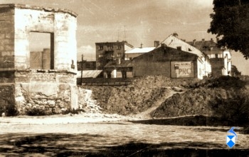 Witam. Ta piękna ruina po lewej stronie to pozostałości po budynku starostwa /lub innego urzędu o podobnym charakterze/.Budynek znajdował się przy Placu Pocztowym. Obecnie jest tam skarpa /obok kamiennych schodów prowadzących z Al. Legionów na Plac Pocztowy. Do czasu wybudowania – przedłużenia AL. Legionów za ruinami było chyba przedsiębiorstwo melioracyjne, potem pierwsza siedziba ŁPB równolegle z barakiem przy tartaku.