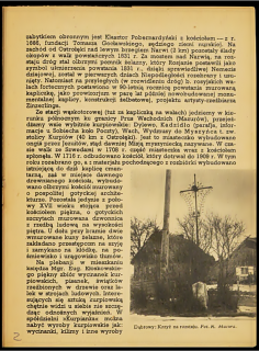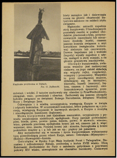 Bardzo ciekawym zabytkiem są spotykane przy drogach krzyże i kapliczki, a na rozstajnych drogach nawet grupy z kilku krzyżów. Nad wodami spotyka się kapliczki ze Świętym Janem. Najciekawsza krzyże drewniane pochodzą z okresu przed 1864 r., w którym to roku Murawiew (rosyjski gen. gub.) wydal okólnik carski zabraniający poza obrębem cmentarzy stawiania lub naprawy starych krzyży, i choć następny okólnik carski z r. 1896 uchylił częściowo poprzedni, nie wskrzesił już dawnego pietyzmu do budowy bogato zdobnych krzyży i kapliczek. Obecne lata są kresem ich żywotności, to też z roku na rok ubywa ich coraz więcej.