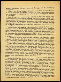 Ze stacji wąskotorowej (tuż za kapliczką na wałach) jedziemy w kierunku północnym ku granicy Prus Wschodnich (Mazurów), przejeżdżamy wsie wybitnie kurpiowskie: Dylewo, Kadzidło (parafja, informacje u Sobiecha koło Poczty), Wach, Wydmusy do Myszyńca t. zw. stolicy Kurpiów (40 km z Ostrołęki). Jest to miasteczko wybudowane ongiś przez Jezuitów, stąd dawniej Misją myszyniecką nazywano. W czasie walk ze Szwedami w 1708 r. część miasteczka wraz z kościołem spłonęła. W 1716 r. odbudowano kościół, który dotrwał do 1909 r. W tym roku rozebrano go, a z materjału pochodzącego z rozbiórki wybudowano istniejącą do dziś kaplicę cmentarną, zaś w miejsce dawnego drewnianego kościoła, wybudowano olbrzymi kościół murowany o pospolitej gotyckiej architekturze. Pozostała jedynie z połowy XVII wieku stojąca przed kościołem piękna, o gotyckich szczytach murowana dzwonnica z rzeźbą ludową na wysokości piętra. U dołu przy bramie dwie wmurowane kuny żelazne, które zakładano przestępcom na szyję i zamykano na kłódkę, na pośmiewisko i urągowisko tłumów.